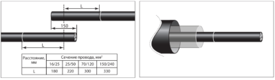 На расстоянии L (согласно таблице) от центра перехлеста сделать кольцевые надрезы оболочки кабеля. Обрезать кабели по центру нахлеста.