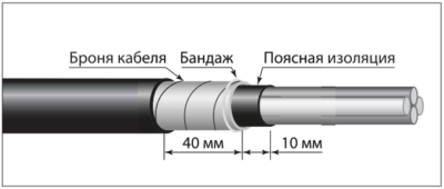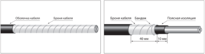 На расстоянии 40 мм от среза оболочки провести ножом кольцевую линию по броне. Размотать ленты брони и отрезать их ножницами по проведенной линии. Ленты брони плотно закрепить проволочным бандажом.