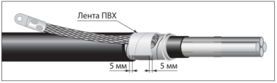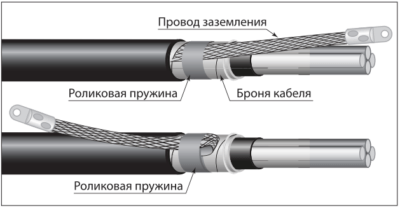 Бронеленты очистить до металлического блеска. Расплести конец жилы заземления длиной не менее 40 мм и разместить его поверх бронелент в направлении конца кабеля. Обернуть роликовую пружину дважды вокруг бронелент с наложенным проводом заземления. Отогнуть конец провода в обратном направлении и довернуть всю роликовую пружину.